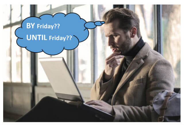s you can see, both BY and UNTIL are followed by a point in time (in the sentences above, these points in time are five o’clock and Friday afternoon.)