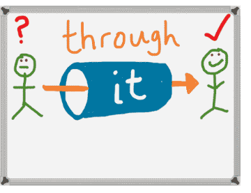 The big blue IT here is like a tunnel. The person needs to GET THROUGH the tunnel in order to achieve what he wants.
